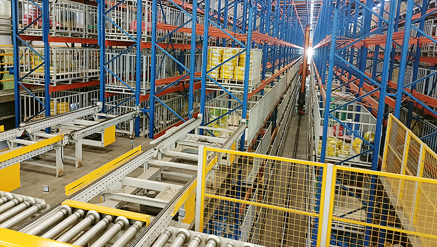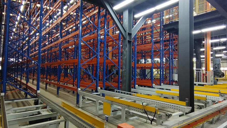 本方案總貨位4326個,高度22m。由3套直式巷道堆垛機(jī)系統(tǒng)、立體貨架系統(tǒng)、74套輸送機(jī)、1套RGV、WMS和WCS系統(tǒng)。提高4倍以上倉儲空間面積,出入庫效率提升3倍以上,24小時不間斷運(yùn)行。